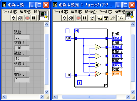 定数「50」のデータがForループの外から入ってそのまま指標付けなしで出て行っている。「数値」は正常だが、他の計算結果がおかしい。